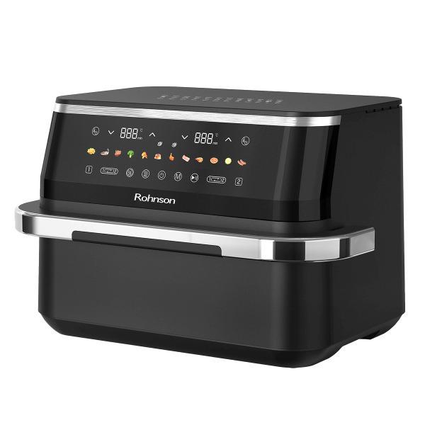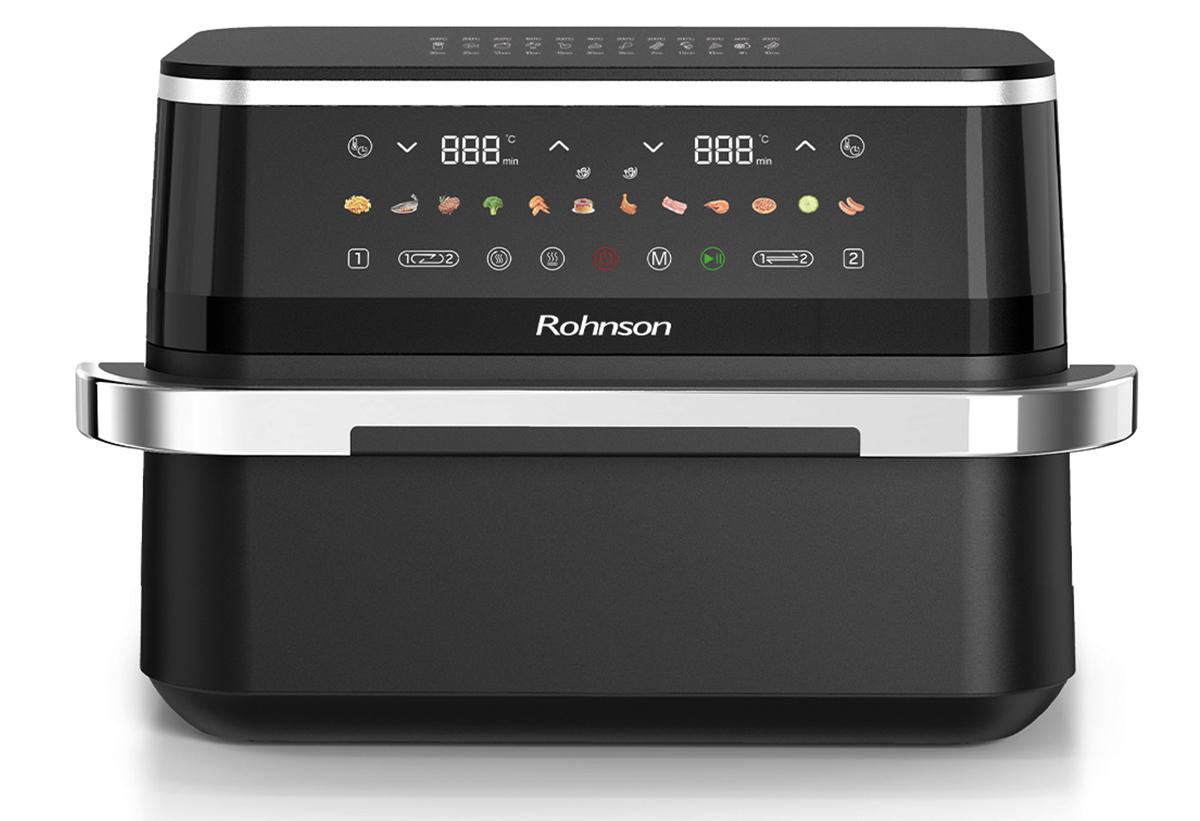 Η φριτέζα αέρος Rohnson R-28019 σας επιτρέπει να μαγειρεύετε δύο διαφορετικά φαγητά ταυτόχρονα, χάρη στους δύο ξεχωριστούς κάδους των 4,5L. Εναλλακτικά, μπορείτε να χρησιμοποιήσετε τον πλήρη κάδο των 9L για μεγαλύτερα γεύματα, εξοικονομώντας χρόνο και χώρο στην κουζίνα, χωρίς να χρειάζεται να χρησιμοποιείτε τον φούρνο.